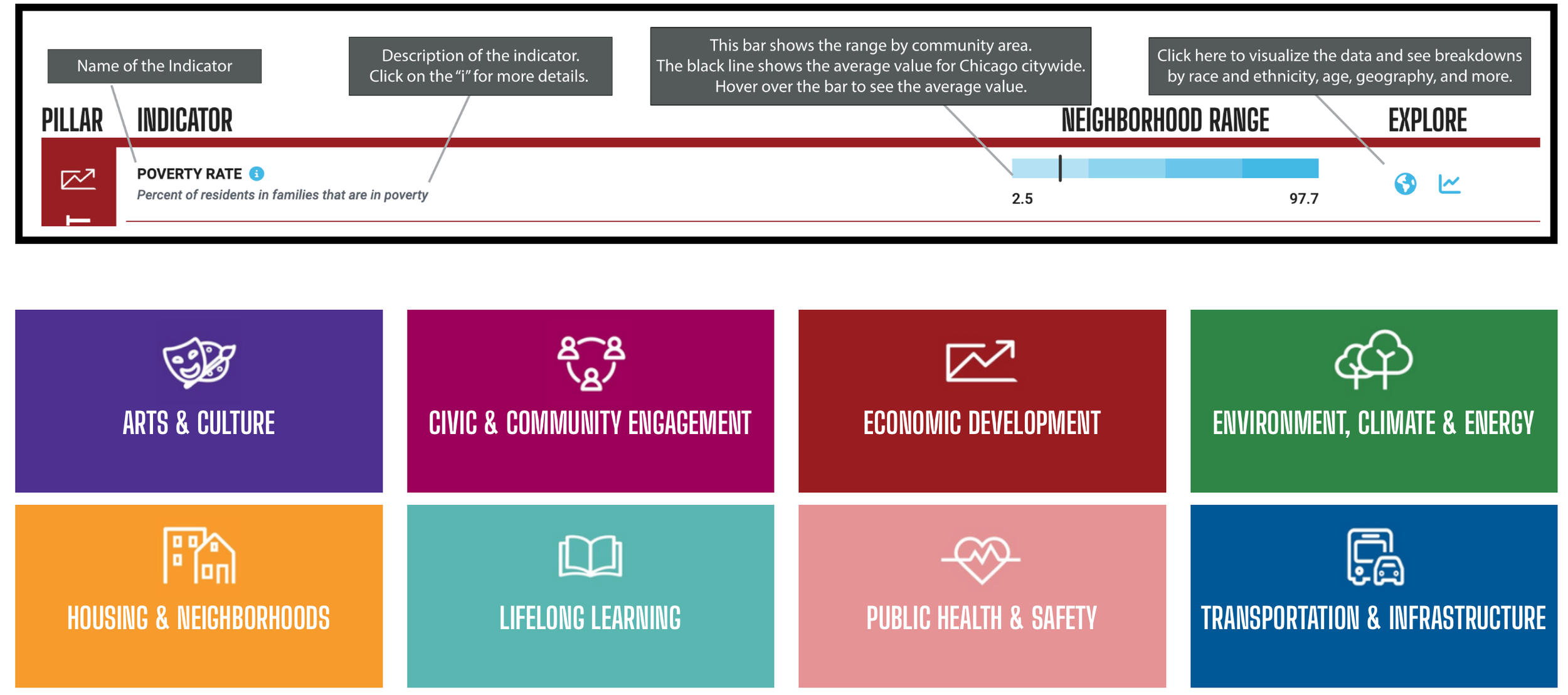 Don’t have time to explore? The Chicago Health Atlas even has pre-made Neighborhood Dashboards with key indicators based on the Chicago Citywide Plan.