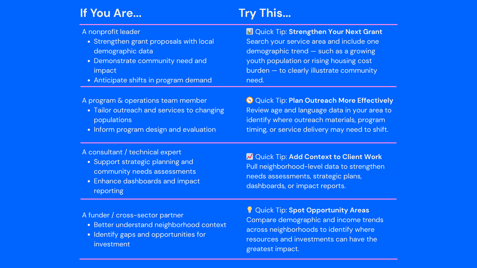 Access to clear, local data helps organizations plan, communicate, and advocate more effectively — freeing up time to focus on the work that matters most.
